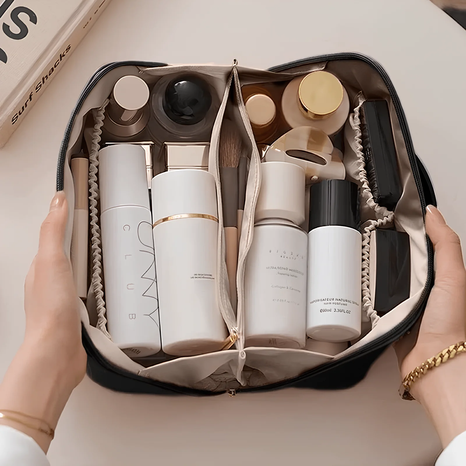 This innovative bag is designed to keep your cosmetics collection neat, secure, and easily accessible, whether you're at home or jet-setting across the globe.